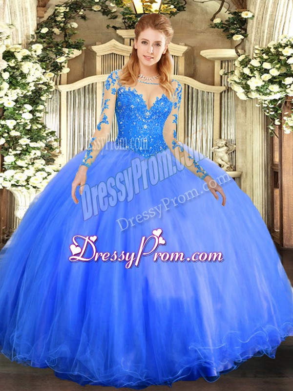 Neckline : ScoopShown Color : BlueSilhouette : Ball GownsSleeve Length : long sleevesHemline : floor lengthBack Detail : Lace upFabric : TulleEmbellishment : LaceOccasion : Military Ball,Sweet 16,QuinceaneraSeason : Spring,Summer,Fall,Winter
