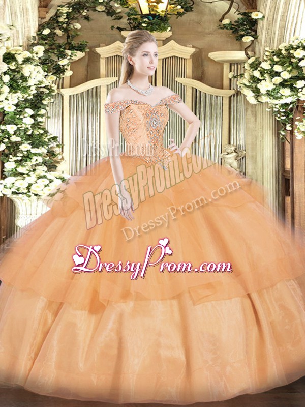 Neckline : Off the shoulderShown Color : OrangeSilhouette : Ball GownsSleeve Length : sleevelessHemline : floor lengthBack Detail : Lace upFabric : OrganzaEmbellishment : Beading,Ruffled LayersOccasion : Military Ball,Sweet 16,QuinceaneraSeason : Spring,Summer,Fall,Winter