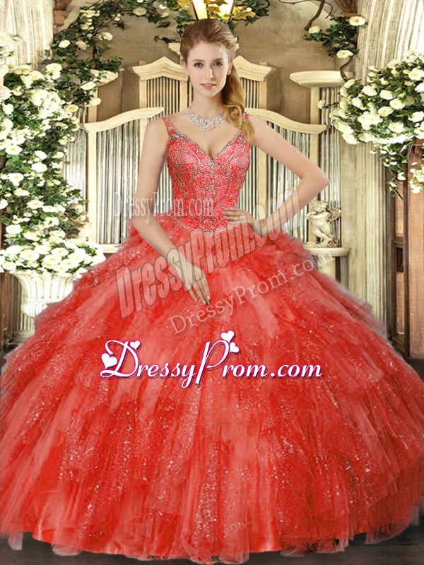 Neckline : V-neckShown Color : RedSilhouette : Ball GownsSleeve Length : sleevelessHemline : floor lengthBack Detail : Lace upFabric : TulleEmbellishment : Beading,RufflesOccasion : Military Ball,Sweet 16,QuinceaneraSeason : Spring,Summer,Fall,Winter