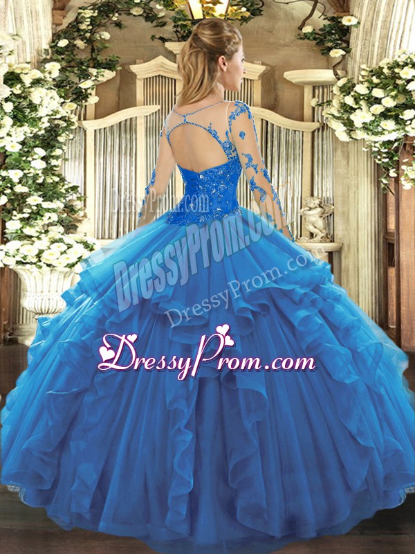 Neckline : ScoopShown Color : FuchsiaSilhouette : Ball GownsSleeve Length : long sleevesHemline : floor lengthBack Detail : Lace upFabric : TulleEmbellishment : Lace,RufflesOccasion : Military Ball,Sweet 16,QuinceaneraSeason : Spring,Summer,Fall,Winter