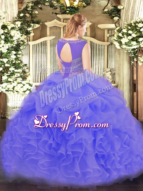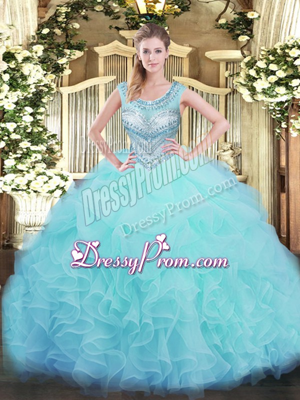 Neckline : ScoopShown Color : Aqua BlueSilhouette : Ball GownsSleeve Length : sleevelessHemline : floor lengthBack Detail : Lace upFabric : OrganzaEmbellishment : Beading,Ruffles,Pick UpsOccasion : Sweet 16,QuinceaneraSeason : Spring,Summer,Fall,Winter