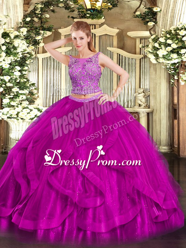 Neckline : ScoopShown Color : FuchsiaSilhouette : Two PiecesSleeve Length : sleevelessHemline : floor lengthBack Detail : ZipperFabric : OrganzaEmbellishment : Beading,RufflesOccasion : Military Ball,Sweet 16,QuinceaneraSeason : Spring,Summer,Fall,Winter