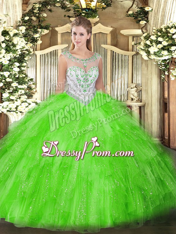 Neckline : ScoopShown Color : Spring GreenSilhouette : Ball GownsSleeve Length : sleevelessHemline : floor lengthBack Detail : ZipperFabric : TulleEmbellishment : Beading,RufflesOccasion : Military Ball,Sweet 16,QuinceaneraSeason : Spring,Summer,Fall,Winter