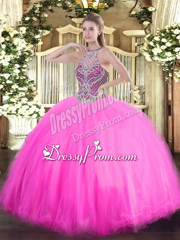 Neckline : Halter topShown Color : Rose Pink Silhouette : Ball GownsSleeve Length : sleevelessHemline : floor lengthBack Detail : Lace upFabric : TulleEmbellishment : BeadingOccasion : Military Ball,Sweet 16,QuinceaneraSeason : Spring,Summer,Fall,Winter