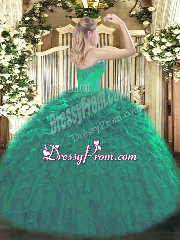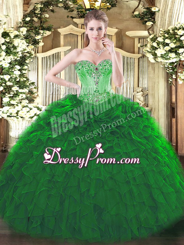 Neckline : SweetheartShown Color : Dark GreenSilhouette : Ball GownsSleeve Length : sleevelessHemline : floor lengthBack Detail : Lace upFabric : OrganzaEmbellishment : Beading,RufflesOccasion : Sweet 16,QuinceaneraSeason : Spring,Summer,Fall,Winter