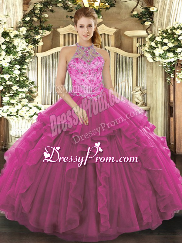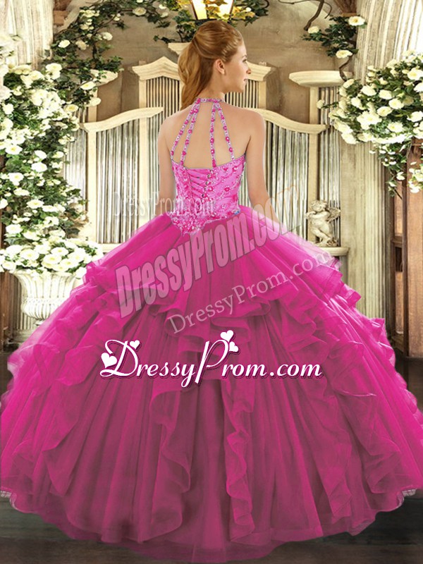 Neckline : Halter topShown Color : FuchsiaSilhouette : Ball GownsSleeve Length : sleevelessHemline : floor lengthBack Detail : Lace upFabric : OrganzaEmbellishment : BeadingOccasion : Military Ball,Sweet 16,QuinceaneraSeason : Spring,Summer,Fall,Winter