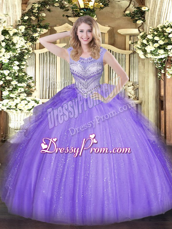 Neckline : ScoopShown Color : LavenderSilhouette : Ball GownsSleeve Length : sleevelessHemline : floor lengthBack Detail : Lace upFabric : TulleEmbellishment : BeadingOccasion : Sweet 16,QuinceaneraSeason : Spring,Summer,Fall,Winter