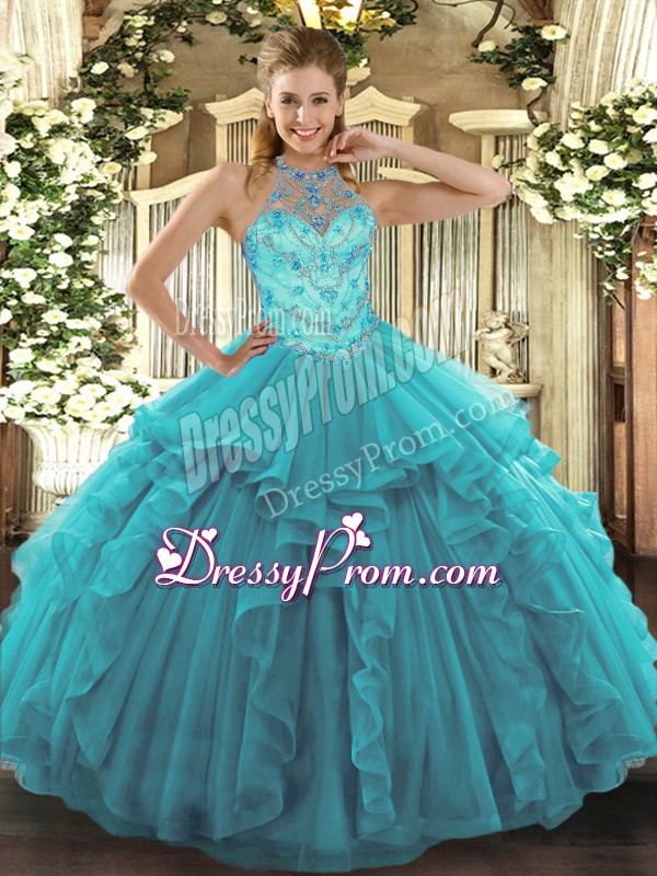Neckline : Halter topShown Color : Teal Silhouette : Ball GownsSleeve Length : sleevelessHemline : floor lengthBack Detail : Lace upFabric : OrganzaEmbellishment : Beading,Embroidery,RufflesOccasion : Military Ball,Sweet 16,QuinceaneraSeason : Spring,Summer,Fall,Winter