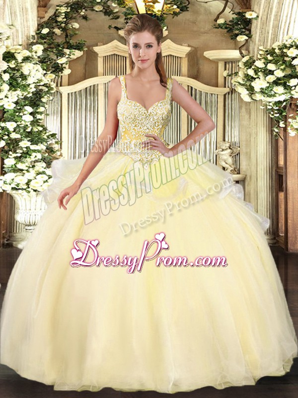 Neckline : StrapsShown Color : GoldSilhouette : Ball GownsSleeve Length : sleevelessHemline : floor lengthBack Detail : Lace upFabric : OrganzaEmbellishment : BeadingOccasion : Military Ball,Sweet 16,QuinceaneraSeason : Spring,Summer,Fall,Winter