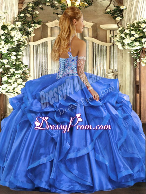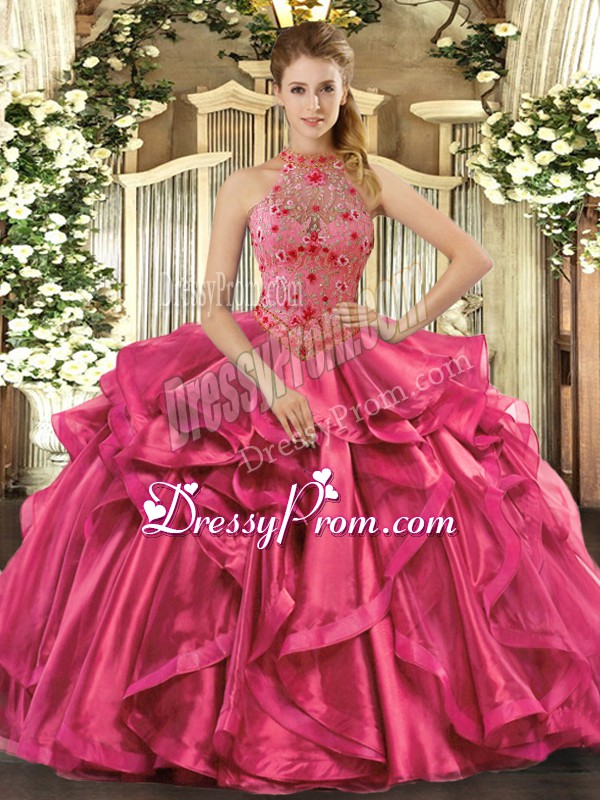 Neckline : Halter topShown Color : Hot PinkSilhouette : Ball GownsSleeve Length : sleevelessHemline : floor lengthBack Detail : Lace upFabric : OrganzaEmbellishment : Beading,Embroidery,RufflesOccasion : Sweet 16,QuinceaneraSeason : Spring,Summer,Fall,Winter