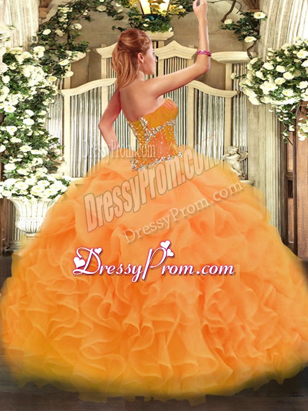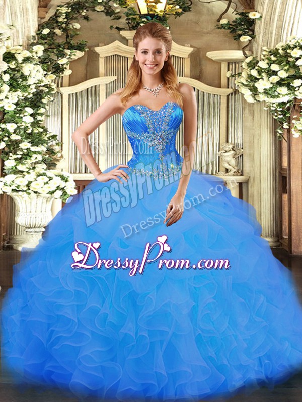 Neckline : SweetheartShown Color : BlueSilhouette : Ball GownsSleeve Length : sleevelessHemline : floor lengthBack Detail : Lace upFabric : OrganzaEmbellishment : Beading,RufflesOccasion : Sweet 16,QuinceaneraSeason : Spring,Summer,Fall,Winter