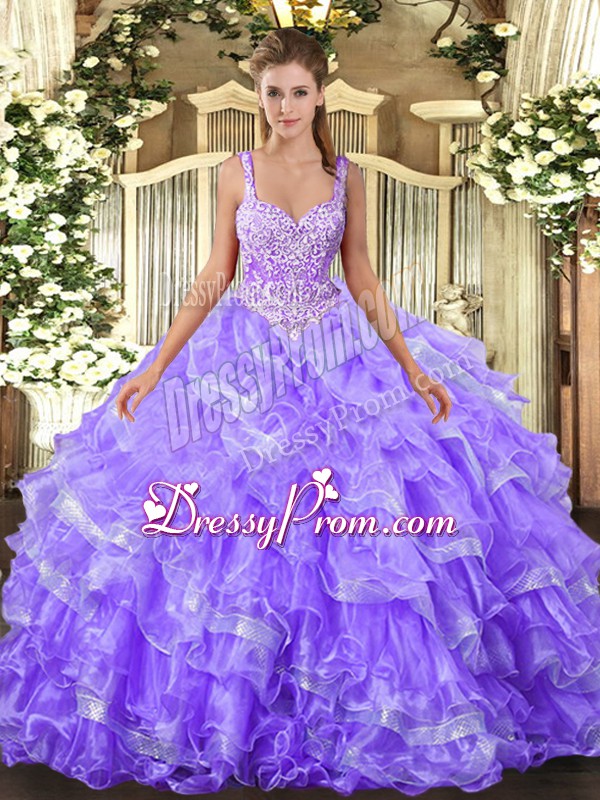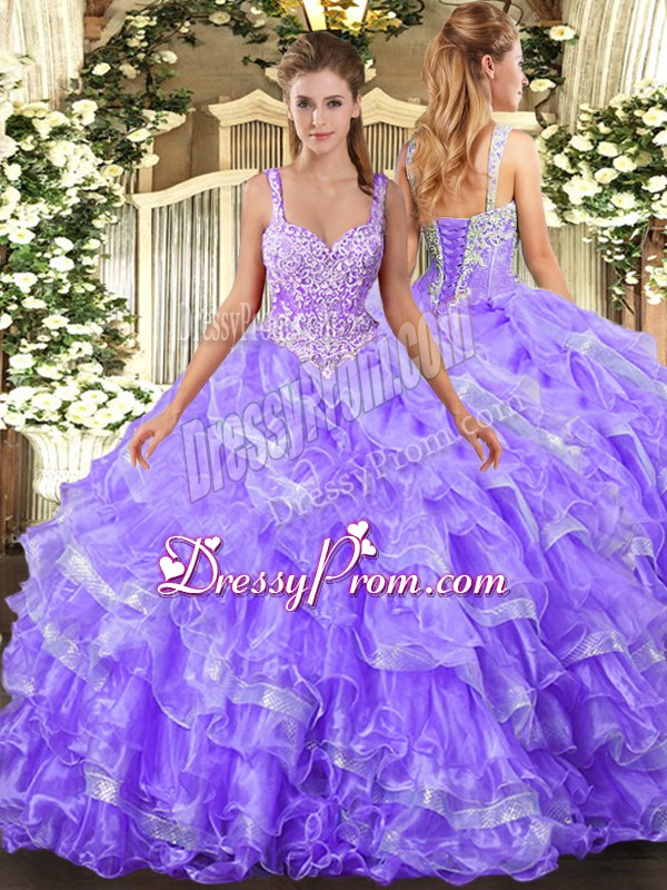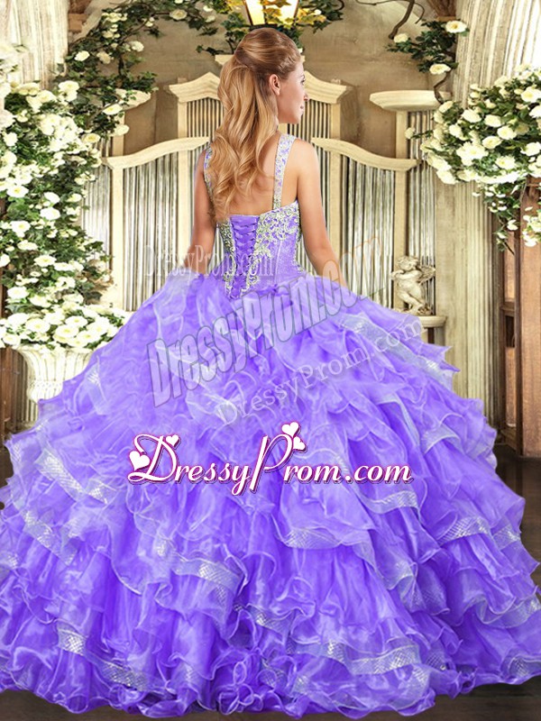 Neckline : StrapsShown Color : LavenderSilhouette : Ball GownsSleeve Length : sleevelessHemline : floor lengthBack Detail : Lace upFabric : OrganzaEmbellishment : Beading,Ruffled LayersOccasion : Military Ball,Sweet 16,QuinceaneraSeason : Spring,Summer,Fall,Winter