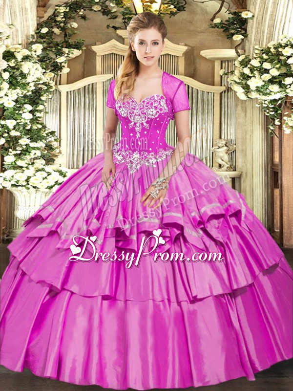 Neckline : SweetheartShown Color : LilacSilhouette : Ball GownsSleeve Length : sleevelessHemline : floor lengthBack Detail : Lace upFabric : Organza,TaffetaEmbellishment : Beading,Ruffled LayersOccasion : Military Ball,Sweet 16,QuinceaneraSeason : Spring,Summer,Fall,Winter