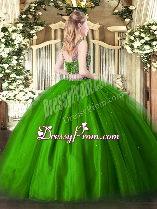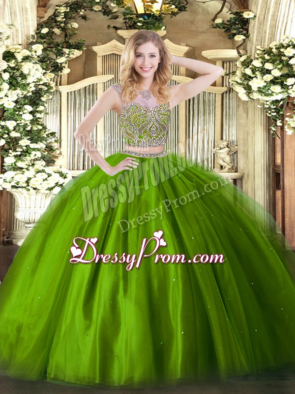 Neckline : ScoopShown Color : Olive GreenSilhouette : Two PiecesSleeve Length : sleevelessHemline : floor lengthBack Detail : Lace upFabric : TulleEmbellishment : BeadingOccasion : Military Ball,Sweet 16,QuinceaneraSeason : Spring,Summer,Fall,Winter