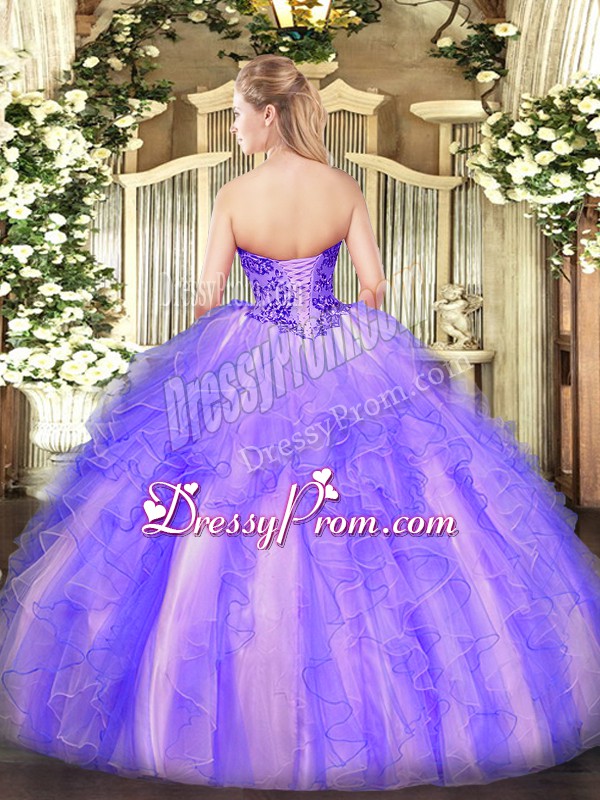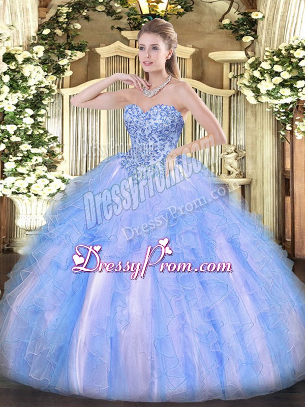 Neckline : SweetheartShown Color : Blue And WhiteSilhouette : Ball GownsSleeve Length : sleevelessHemline : floor lengthBack Detail : Lace upFabric : OrganzaEmbellishment : Appliques,RufflesOccasion : Sweet 16,QuinceaneraSeason : Spring,Summer,Fall,Winter