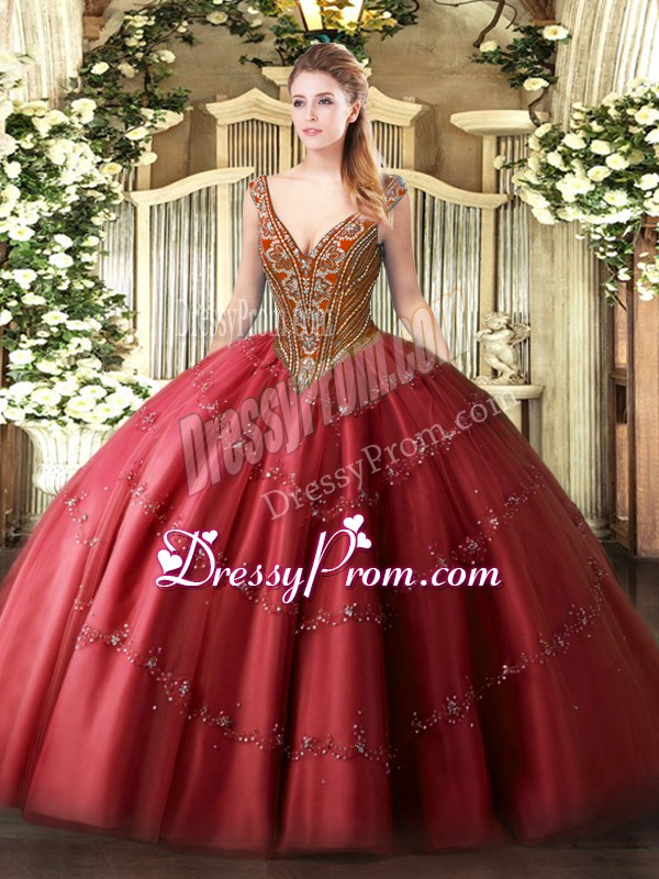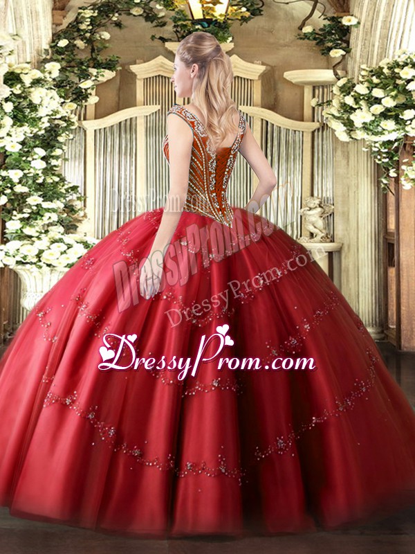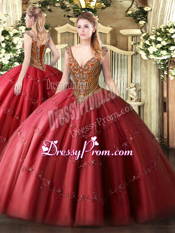 Neckline : V-neckShown Color : RedSilhouette : Ball GownsSleeve Length : sleevelessHemline : floor lengthBack Detail : Lace upFabric : TulleEmbellishment : Beading,AppliquesOccasion : Military Ball,Sweet 16,QuinceaneraSeason : Spring,Summer,Fall,Winter