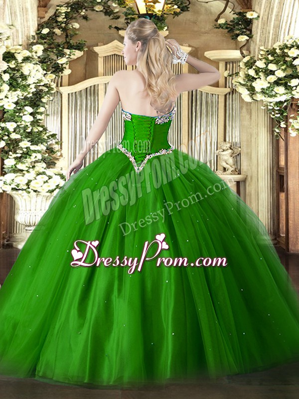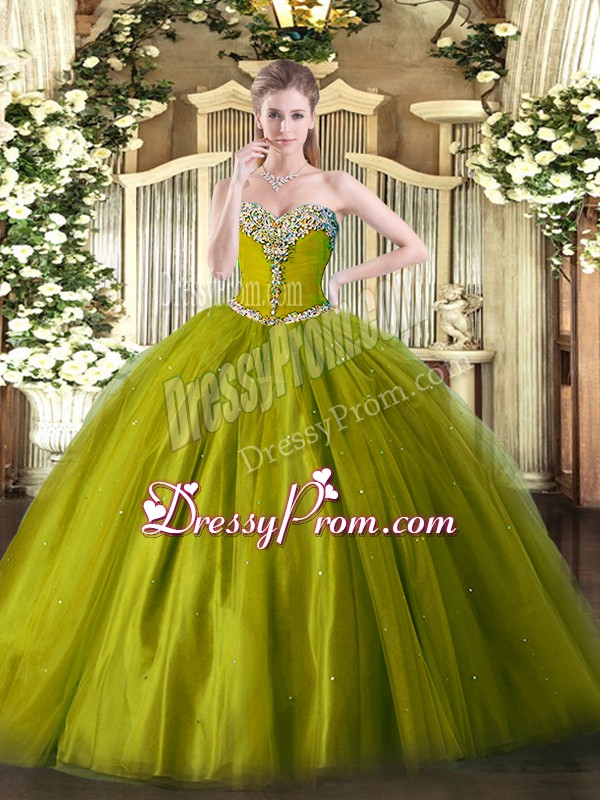 Neckline : SweetheartShown Color : Olive GreenSilhouette : Ball GownsSleeve Length : sleevelessHemline : floor lengthBack Detail : Lace upFabric : TulleEmbellishment : BeadingOccasion : Military Ball,Sweet 16,QuinceaneraSeason : Spring,Summer,Fall,Winter