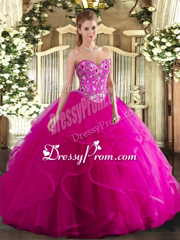 Neckline : SweetheartShown Color : FuchsiaSilhouette : Ball GownsSleeve Length : sleevelessHemline : floor lengthBack Detail : Lace upFabric : TulleEmbellishment : Embroidery,RufflesOccasion : Military Ball,Sweet 16,QuinceaneraSeason : Spring,Summer,Fall,Winter