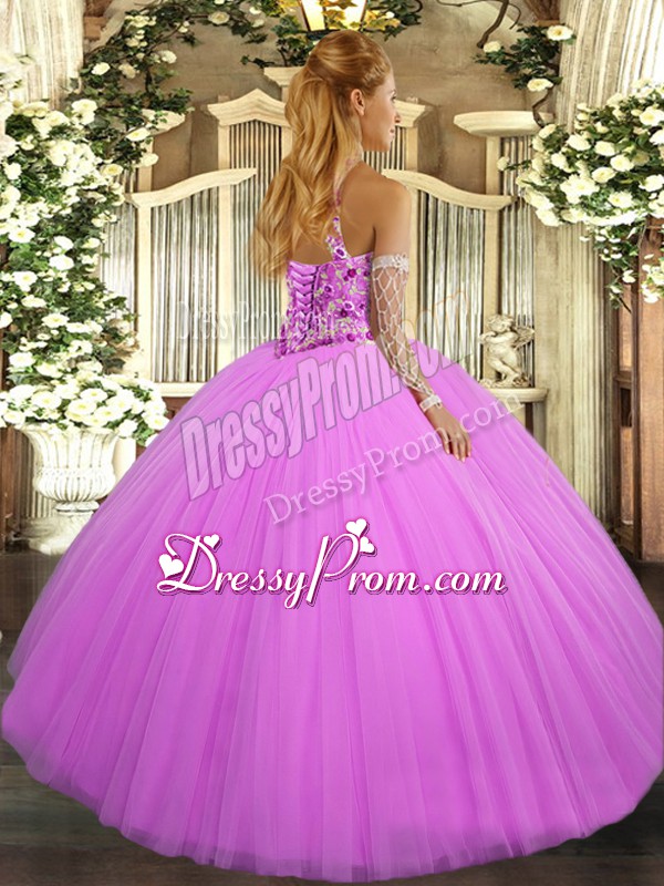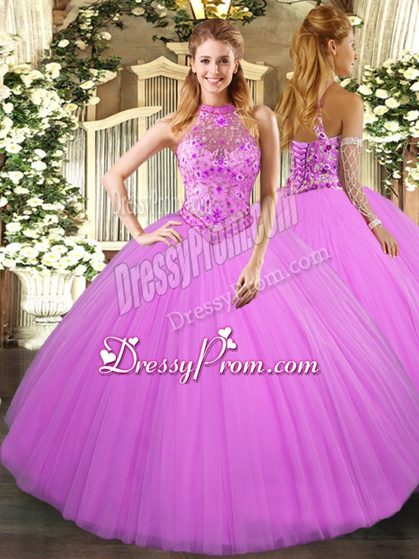 Neckline : Halter topShown Color : LilacSilhouette : Ball GownsSleeve Length : sleevelessHemline : floor lengthBack Detail : Lace upFabric : TulleEmbellishment : Beading,EmbroideryOccasion : Sweet 16,QuinceaneraSeason : Spring,Summer,Fall,Winter