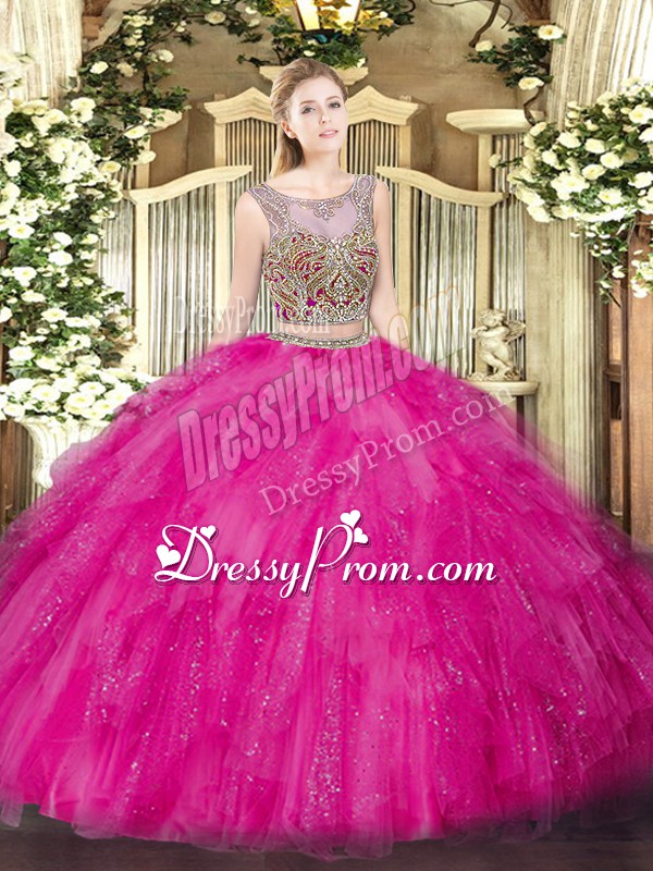 Neckline : ScoopShown Color : Hot PinkSilhouette : Two PiecesSleeve Length : sleevelessHemline : floor lengthBack Detail : Lace upFabric : TulleEmbellishment : Beading,RufflesOccasion : Military Ball,Sweet 16,QuinceaneraSeason : Spring,Summer,Fall,Winter