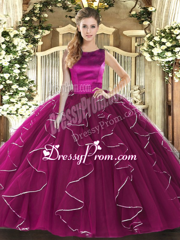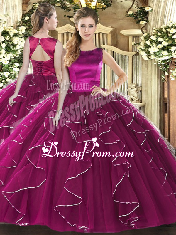 Fuchsia Lace Up Sweet 16 Dresses Ruffles Sleeveless Floor Length