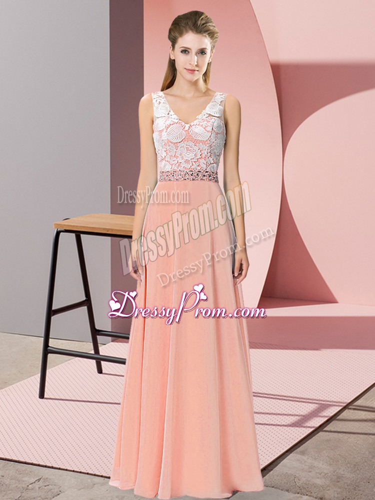 Neckline : V-neckShown Color : PeachSilhouette : EmpireSleeve Length : sleevelessHemline : floor lengthBack Detail : BacklessFabric : Chiffon,LaceEmbellishment : BeadingOccasion : Prom,PartySeason : Spring,Summer,Fall,Winter