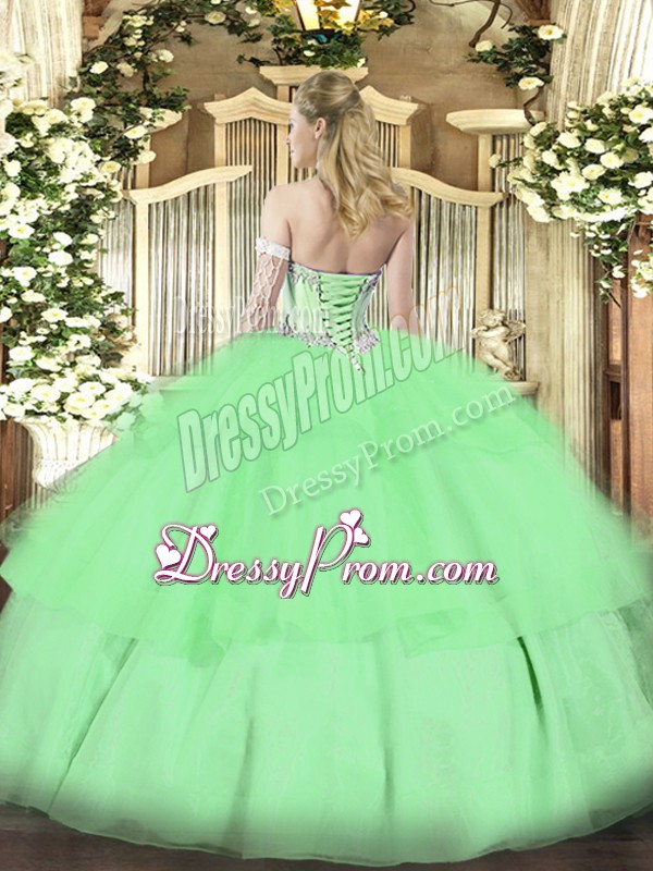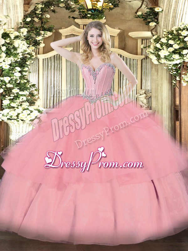 Neckline : SweetheartShown Color : Baby PinkSilhouette : Ball GownsSleeve Length : sleevelessHemline : floor lengthBack Detail : Lace upFabric : TulleEmbellishment : Beading,Ruffled LayersOccasion : Military Ball,Sweet 16,QuinceaneraSeason : Spring,Summer,Fall,Winter
