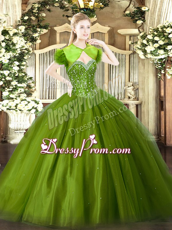 Neckline : SweetheartShown Color : Olive GreenSilhouette : Ball GownsSleeve Length : sleevelessHemline : floor lengthBack Detail : Lace upFabric : TulleEmbellishment : BeadingOccasion : Military Ball,Sweet 16,QuinceaneraSeason : Spring,Summer,Fall,Winter
