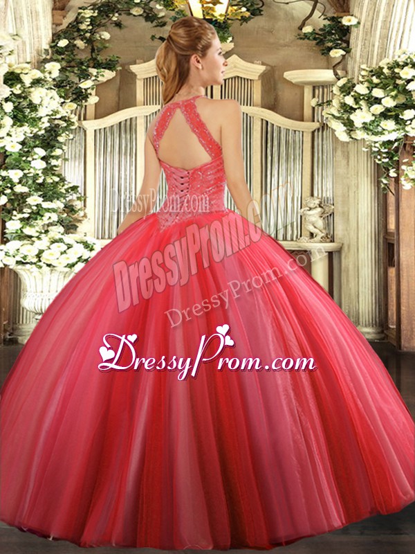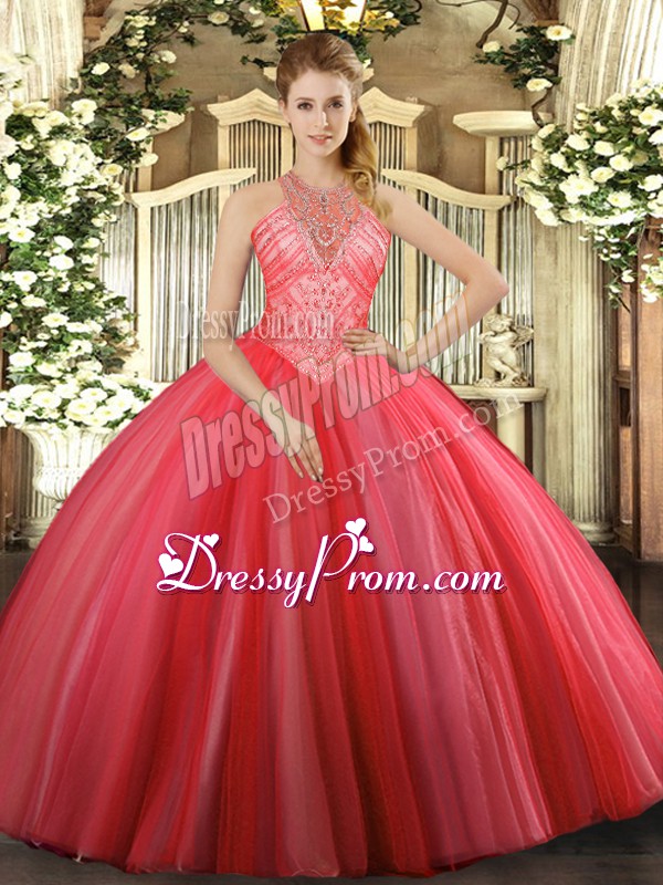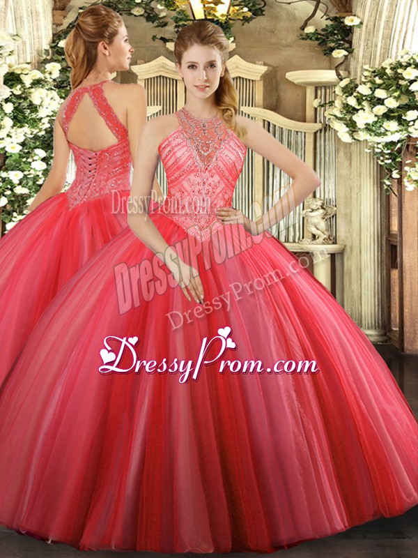 Neckline : High-neckShown Color : Coral RedSilhouette : Ball GownsSleeve Length : sleevelessHemline : floor lengthBack Detail : Lace upFabric : TulleEmbellishment : BeadingOccasion : Military Ball,Sweet 16,QuinceaneraSeason : Spring,Summer,Fall,Winter