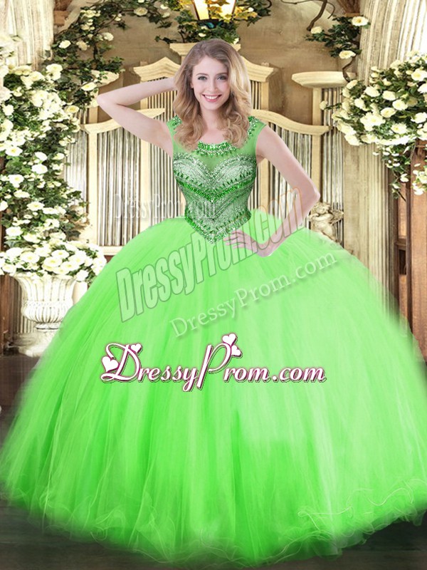 Neckline : ScoopShown Color : Spring GreenSilhouette : Ball GownsSleeve Length : sleevelessHemline : floor lengthBack Detail : Lace upFabric : TulleEmbellishment : BeadingOccasion : Sweet 16,QuinceaneraSeason : Spring,Summer,Fall,Winter