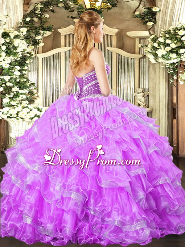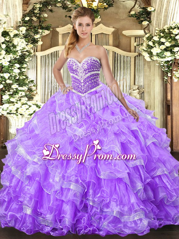 Neckline : SweetheartShown Color : LavenderSilhouette : Ball GownsSleeve Length : sleevelessHemline : floor lengthBack Detail : Lace upFabric : OrganzaEmbellishment : Ruffled LayersOccasion : Military Ball,Sweet 16,QuinceaneraSeason : Spring,Summer,Fall,Winter