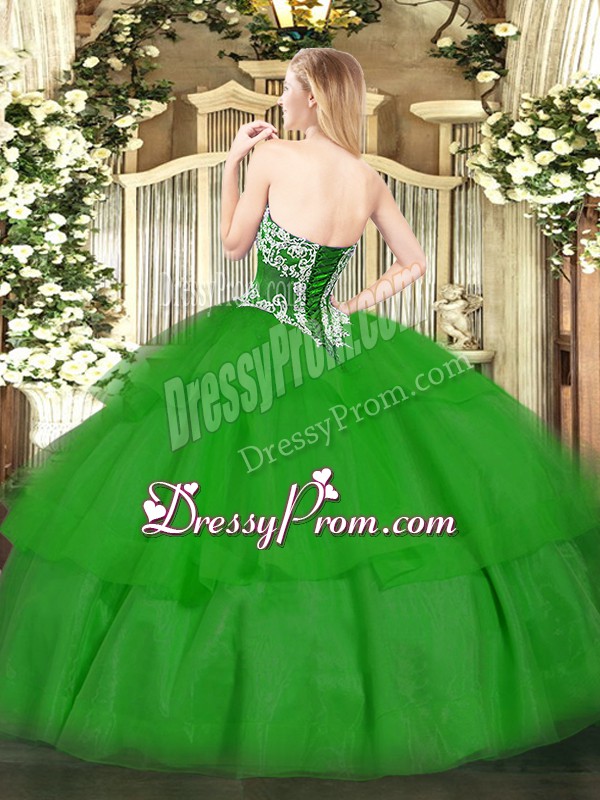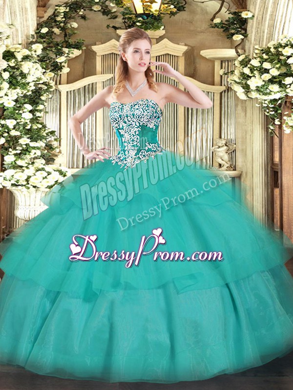 Neckline : StraplessShown Color : TurquoiseSilhouette : Ball GownsSleeve Length : sleevelessHemline : floor lengthBack Detail : Lace upFabric : TulleEmbellishment : Beading,Ruffled LayersOccasion : Military Ball,Sweet 16,QuinceaneraSeason : Spring,Summer,Fall,Winter