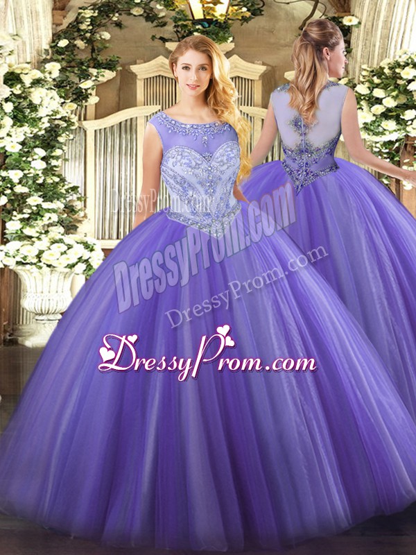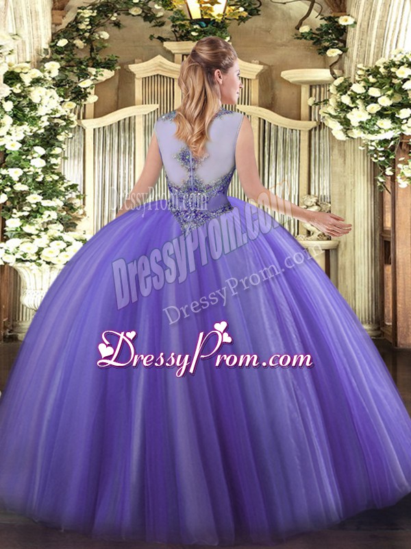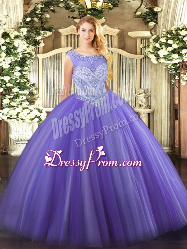 Neckline : ScoopShown Color : LavenderSilhouette : Ball GownsSleeve Length : sleevelessHemline : floor lengthBack Detail : ZipperFabric : TulleEmbellishment : BeadingOccasion : Sweet 16,QuinceaneraSeason : Spring,Summer,Fall,Winter