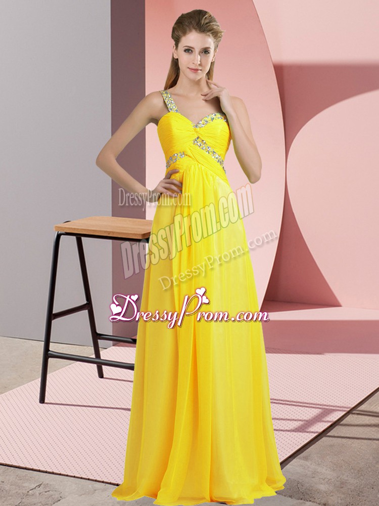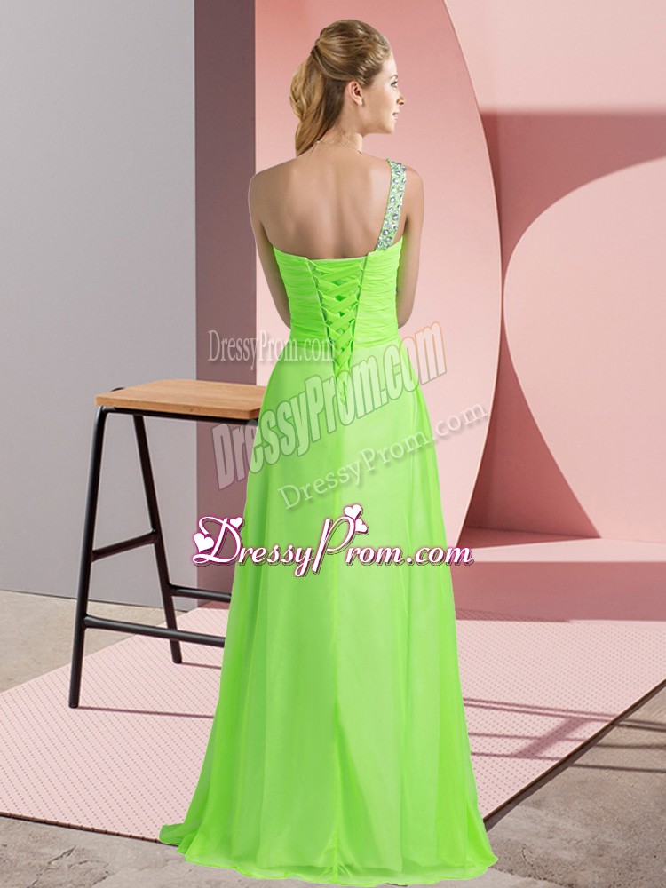 Neckline : One shoulderShown Color : YellowSilhouette : EmpireSleeve Length : sleevelessHemline : floor lengthBack Detail : Lace upFabric : ChiffonEmbellishment : BeadingOccasion : Prom,PartySeason : Spring,Summer,Fall,Winter