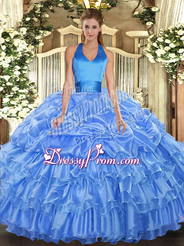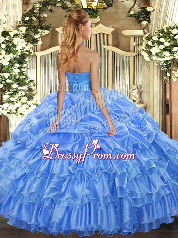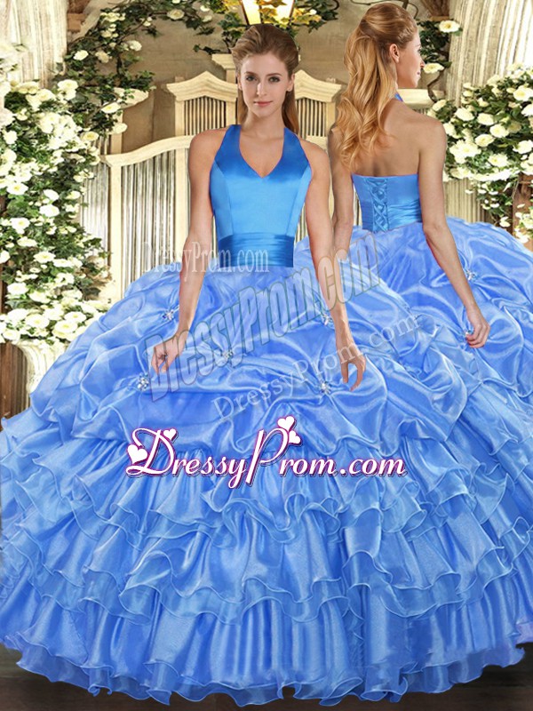 Neckline : Halter topShown Color : Baby BlueSilhouette : Ball GownsSleeve Length : sleevelessHemline : floor lengthBack Detail : Lace upFabric : OrganzaEmbellishment : Ruffled Layers,Pick UpsOccasion : Military Ball,Sweet 16,QuinceaneraSeason : Spring,Summer,Fall,Winter