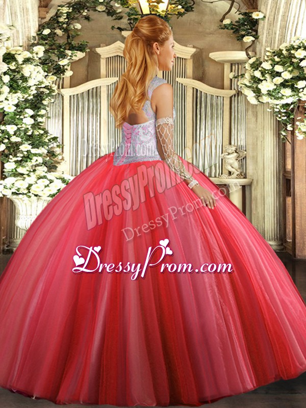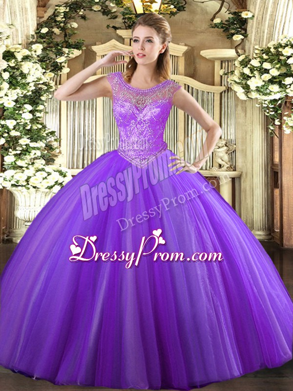 Neckline : ScoopShown Color : LavenderSilhouette : Ball GownsSleeve Length : sleevelessHemline : floor lengthBack Detail : Lace upFabric : TulleEmbellishment : BeadingOccasion : Sweet 16,QuinceaneraSeason : Spring,Summer,Fall,Winter