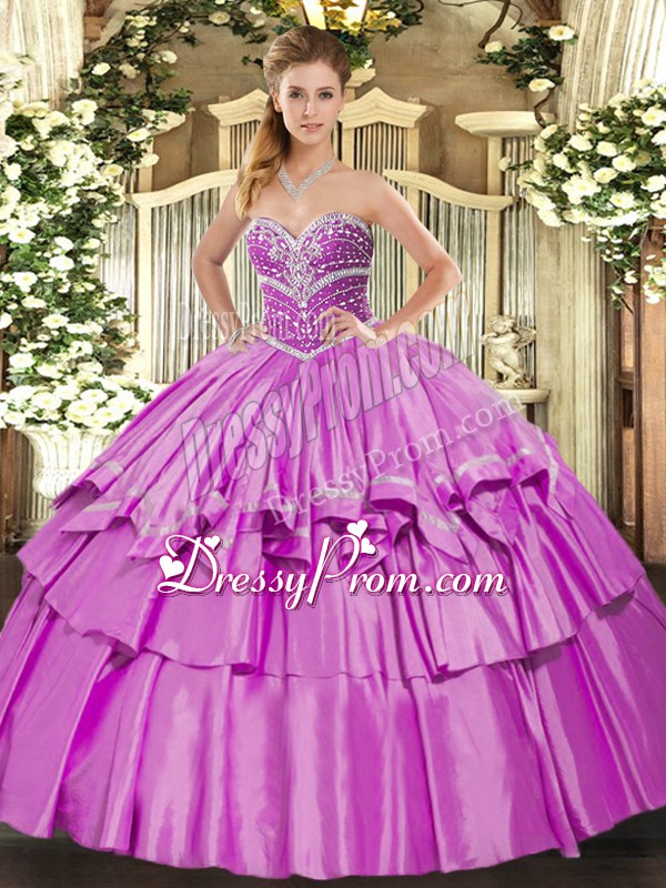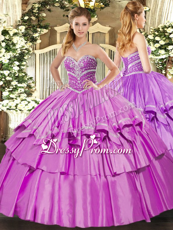 Neckline : SweetheartShown Color : LilacSilhouette : Ball GownsSleeve Length : sleevelessHemline : floor lengthBack Detail : Lace upFabric : Organza,TaffetaEmbellishment : Beading,Ruffled LayersOccasion : Military Ball,Sweet 16,QuinceaneraSeason : Spring,Summer,Fall,Winter