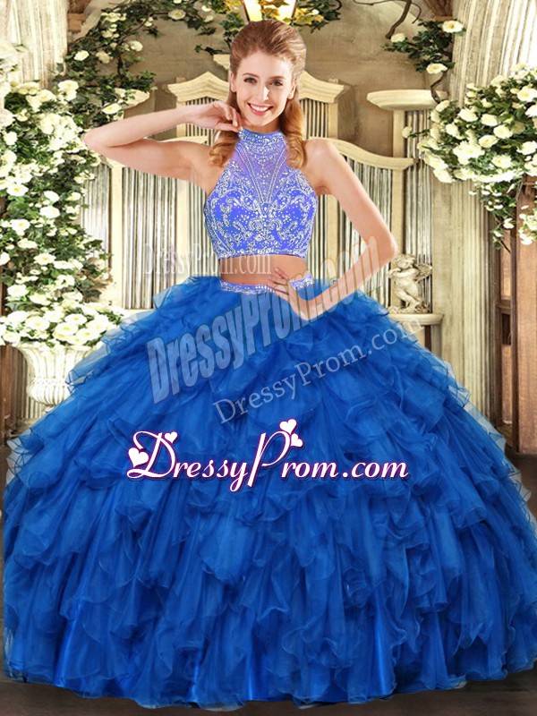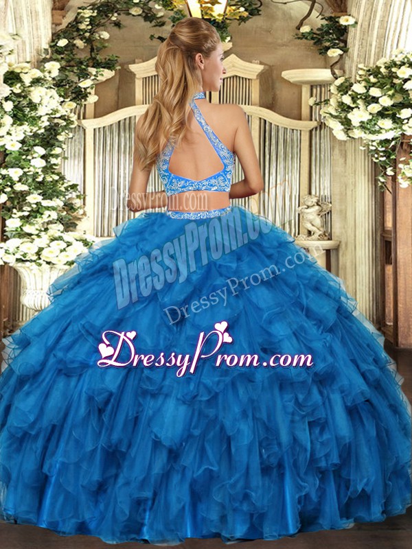 Neckline : Halter top Shown Color : Royal Blue Silhouette : Two Pieces Sleeve Length : sleeveless Hemline : floor length Back Detail : Criss cross Fabric : Organza Embellishment : Beading,Ruffles Occasion : Military Ball,Sweet 16,Quinceanera Season : Spring,Summer,Fall,Winter