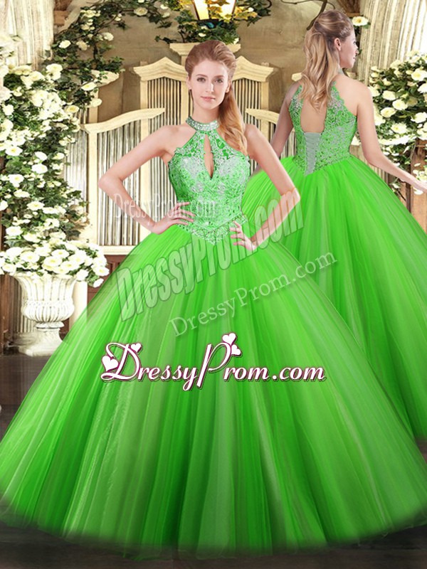 Neckline : Halter top Shown Color : Spring Green Silhouette : Ball Gowns Sleeve Length : sleeveless Hemline : floor length Back Detail : Lace up Fabric : Tulle Embellishment : Sequins Occasion : Military Ball,Sweet 16,Quinceanera Season : Spring,Summer,Fall,Winter