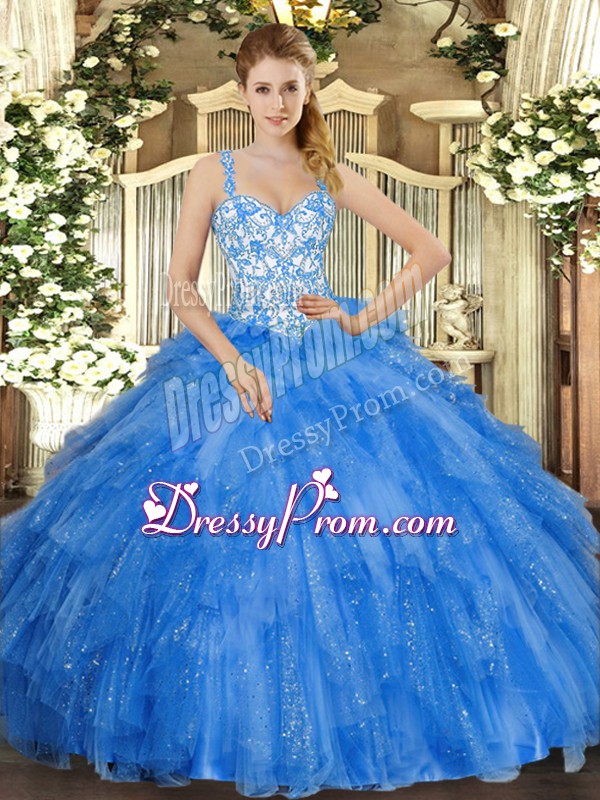 Stylish Beading and Ruffles Quinceanera Gown Blue Lace Up Sleeveless Floor Length