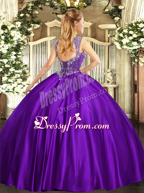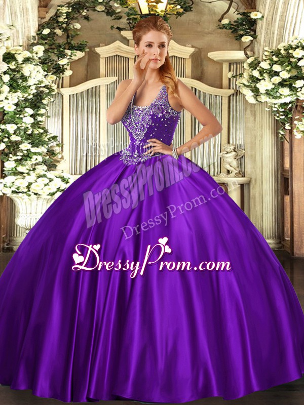Neckline : StrapsShown Color : PurpleSilhouette : Ball GownsSleeve Length : sleevelessHemline : floor lengthBack Detail : Lace upFabric : SatinEmbellishment : BeadingOccasion : Military Ball,Sweet 16,QuinceaneraSeason : Spring,Summer,Fall,Winter
