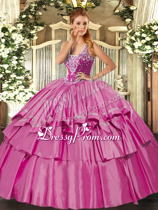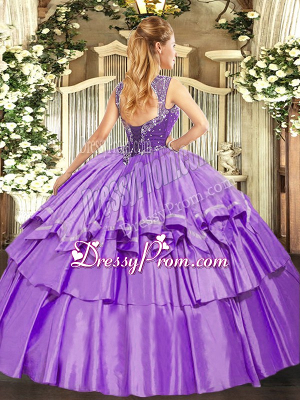 Neckline : StrapsShown Color : LilacSilhouette : Ball GownsSleeve Length : sleevelessHemline : floor lengthBack Detail : Lace upFabric : Organza,TaffetaEmbellishment : Beading,Ruffled LayersOccasion : Military Ball,Sweet 16,QuinceaneraSeason : Spring,Summer,Fall,Winter