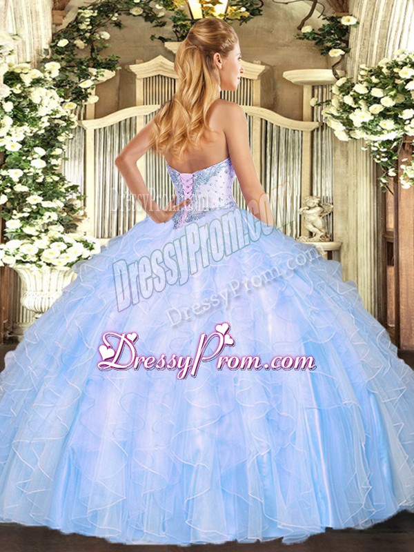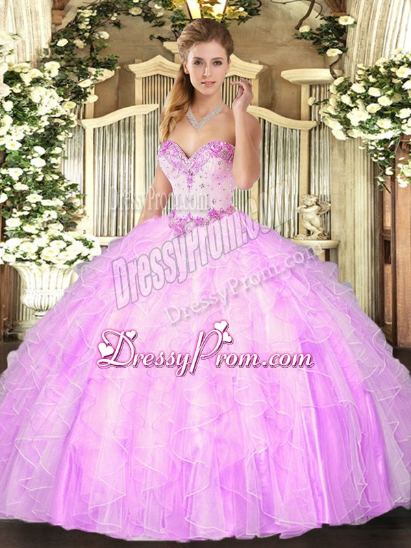 Low Price Sleeveless Organza Floor Length Lace Up Quince Ball Gowns in Lilac with Beading and Ruffles