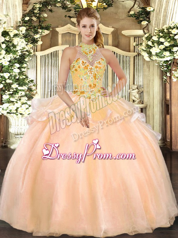 Neckline : Halter topShown Color : PeachSilhouette : Ball GownsSleeve Length : sleevelessHemline : floor lengthBack Detail : Lace upFabric : OrganzaEmbellishment : EmbroideryOccasion : Military Ball,Sweet 16,QuinceaneraSeason : Spring,Summer,Fall,Winter