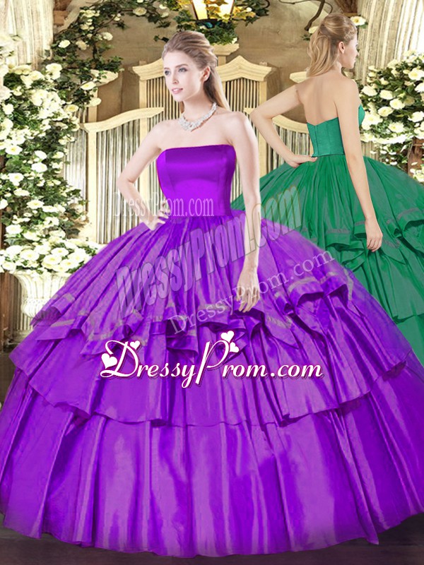 Neckline : StraplessShown Color : Eggplant PurpleSilhouette : Ball GownsSleeve Length : sleevelessHemline : floor lengthBack Detail : ZipperFabric : Organza,TaffetaEmbellishment : Ruffled LayersOccasion : Military Ball,Sweet 16,QuinceaneraSeason : Spring,Summer,Fall,Winter