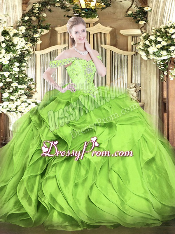 Neckline : Off the shoulder Shown Color : Spring Green Silhouette : Ball Gowns Sleeve Length : sleeveless Hemline : floor length Back Detail : Lace up Fabric : Organza Embellishment : Beading,Ruffles Occasion : Military Ball,Sweet 16,Quinceanera Season : Spring,Summer,Fall,Winter