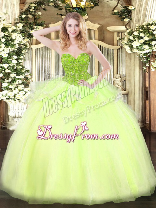 Neckline : SweetheartShown Color : Yellow GreenSilhouette : Ball GownsSleeve Length : sleevelessHemline : floor lengthBack Detail : Lace upFabric : OrganzaEmbellishment : BeadingOccasion : Military Ball,Sweet 16,QuinceaneraSeason : Spring,Summer,Fall,Winter