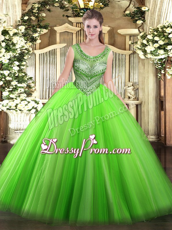 Neckline : ScoopShown Color : Spring GreenSilhouette : Ball GownsSleeve Length : sleevelessHemline : floor lengthBack Detail : Lace upFabric : TulleEmbellishment : BeadingOccasion : Sweet 16,QuinceaneraSeason : Spring,Summer,Fall,Winter