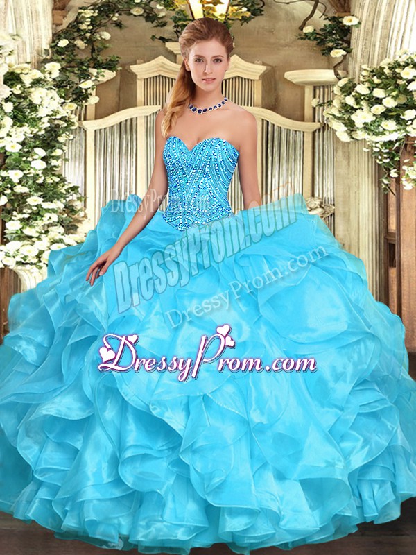 Neckline : SweetheartShown Color : Aqua BlueSilhouette : Ball GownsSleeve Length : sleevelessHemline : floor lengthBack Detail : Lace upFabric : OrganzaEmbellishment : Beading,RufflesOccasion : Military Ball,Sweet 16,QuinceaneraSeason : Spring,Summer,Fall,Winter