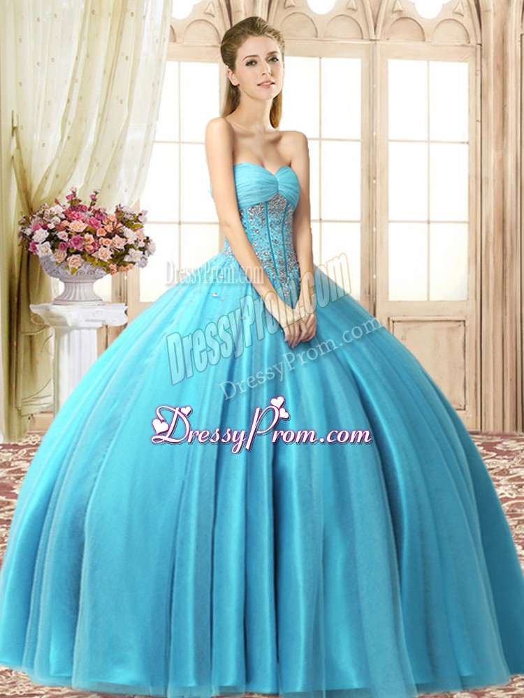 Neckline : SweetheartShown Color : Aqua BlueSilhouette : Ball GownsSleeve Length : sleevelessHemline : floor lengthBack Detail : Lace upFabric : TulleEmbellishment : BeadingOccasion : Military Ball,Sweet 16,QuinceaneraSeason : Spring,Summer,Fall,Winter